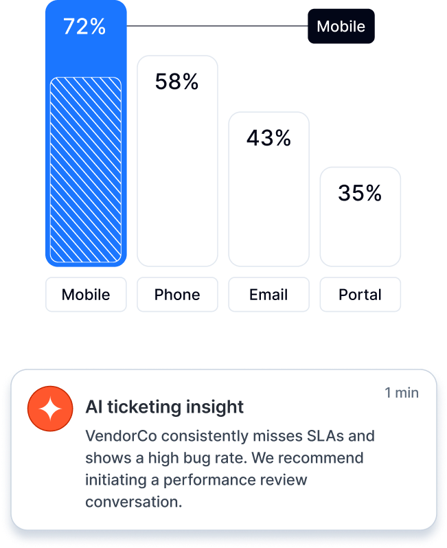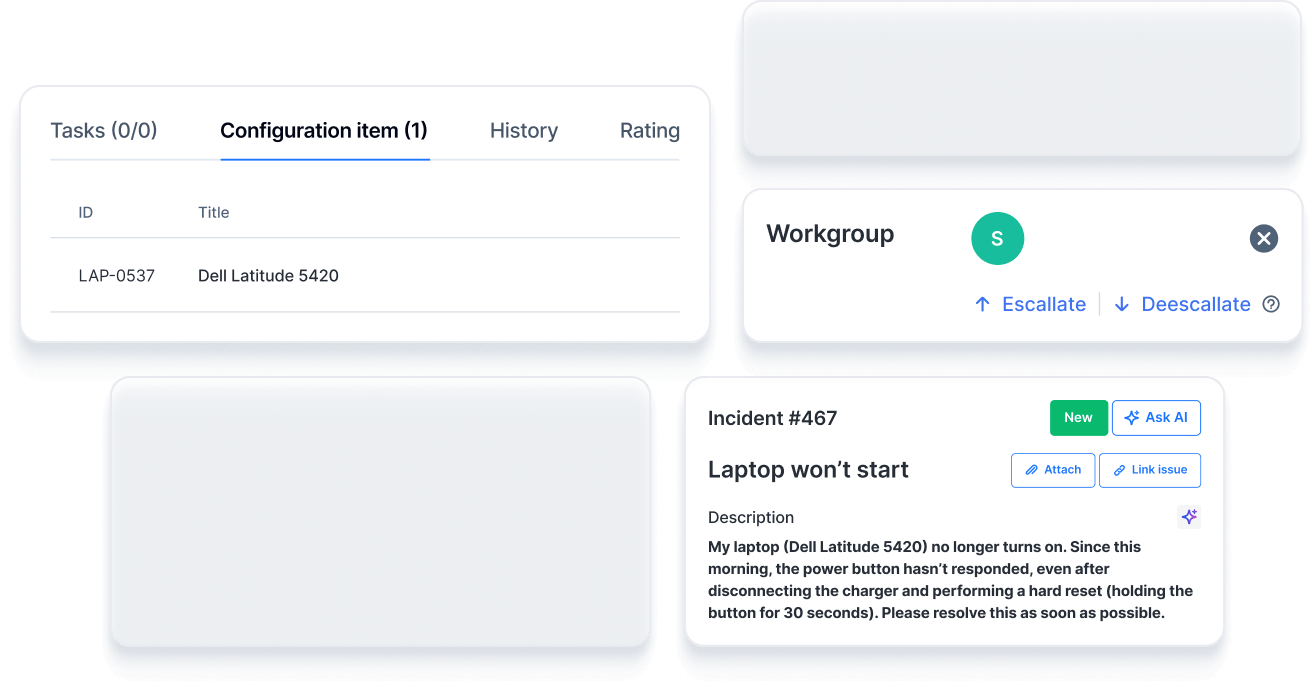 Restore service faster with AI-driven triage and smart routing. Users report issues in plain language, while AI gathers missing details, assigns the right team, and prevents SLA breaches.