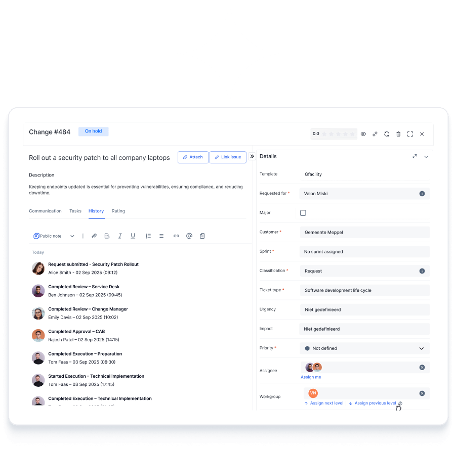 Keep IT stable and compliant with structured, ITIL-aligned change processes. Plan, approve, and track changes with full visibility - reducing risk while speeding up delivery.