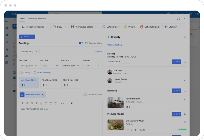 Employees plan meetings effortlessly in Microsoft Outlook or Google Calendar – booking rooms, catering, and visitors in one go. Communication with service teams happens naturally via Teams or Chat.