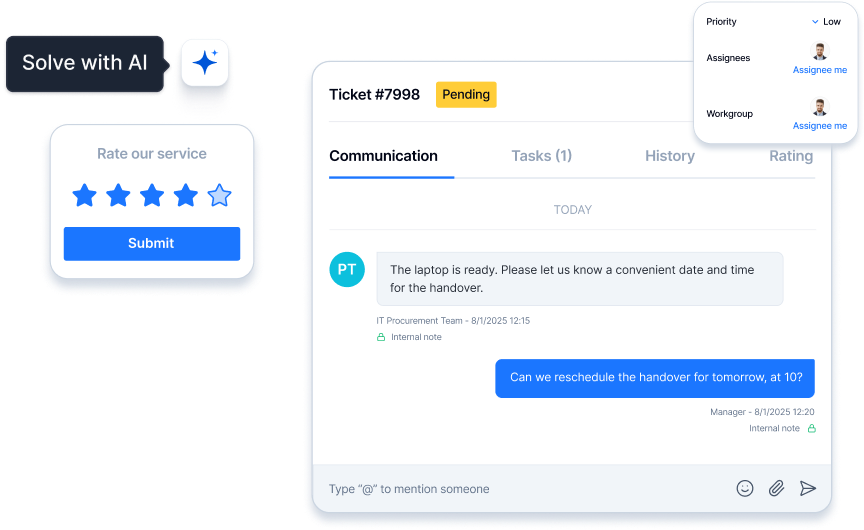 Give users and agents instant answers with a searchable, AI-integrated knowledge base. Capture fixes once and reuse them everywhere to cut ticket volume and resolution times.