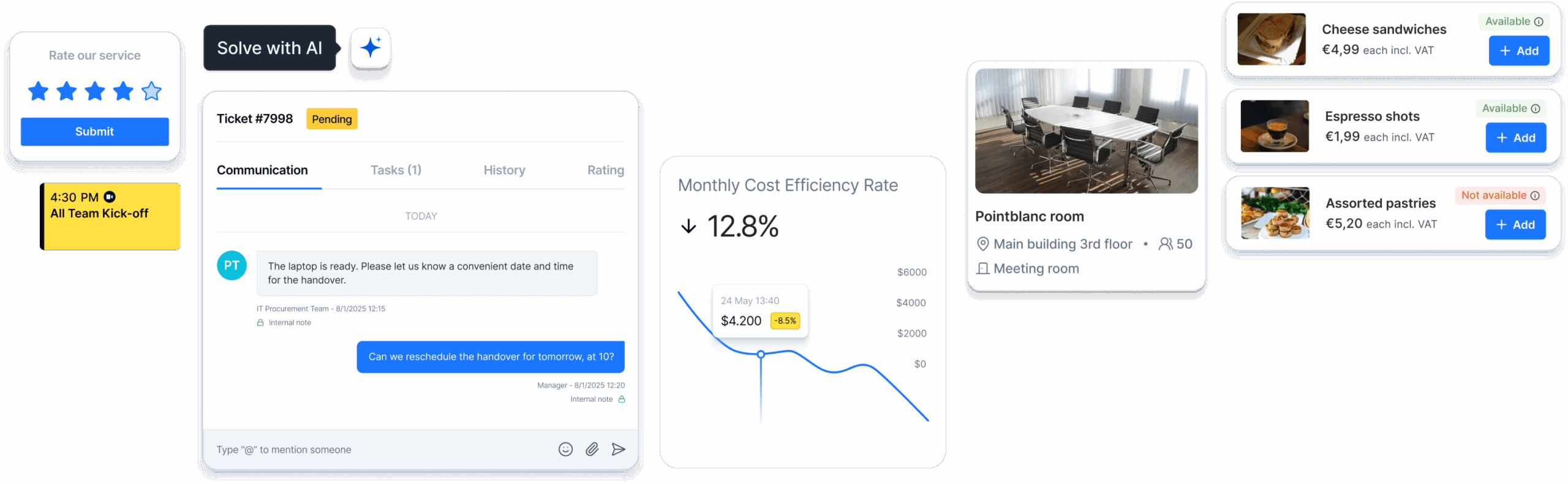 Our AI-powered solutions adapt to your organization and scale with your ambitions, helping IT, Facility Management, and HR departments in: