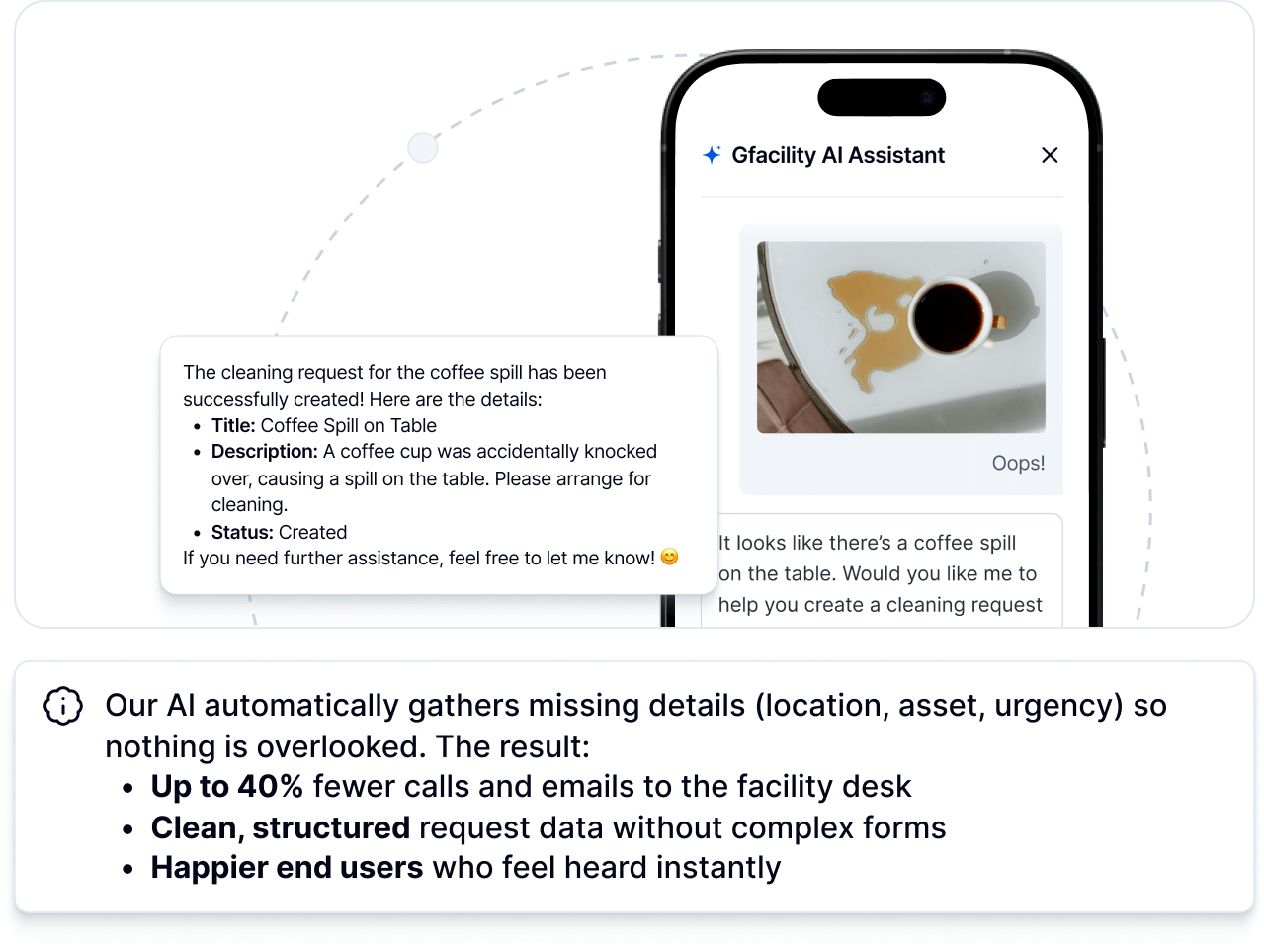 Resolve requests faster, keep occupants happy, and run facilities more efficiently. Gfacility’s AI-powered Facility Management Helpdesk automates repetitive tasks, routes requests instantly to the right team, and gives facility managers complete control and visibility - all in one platform.