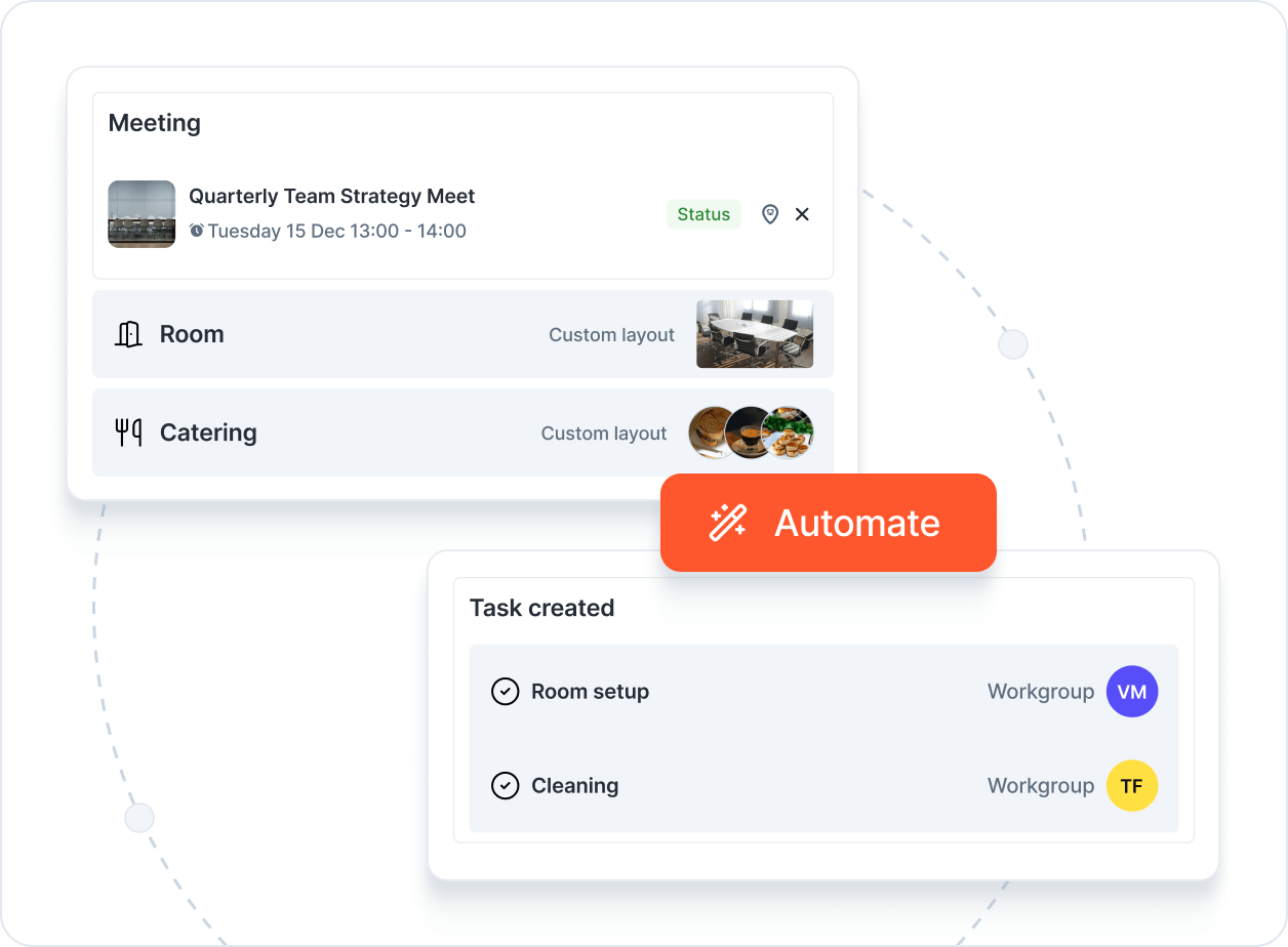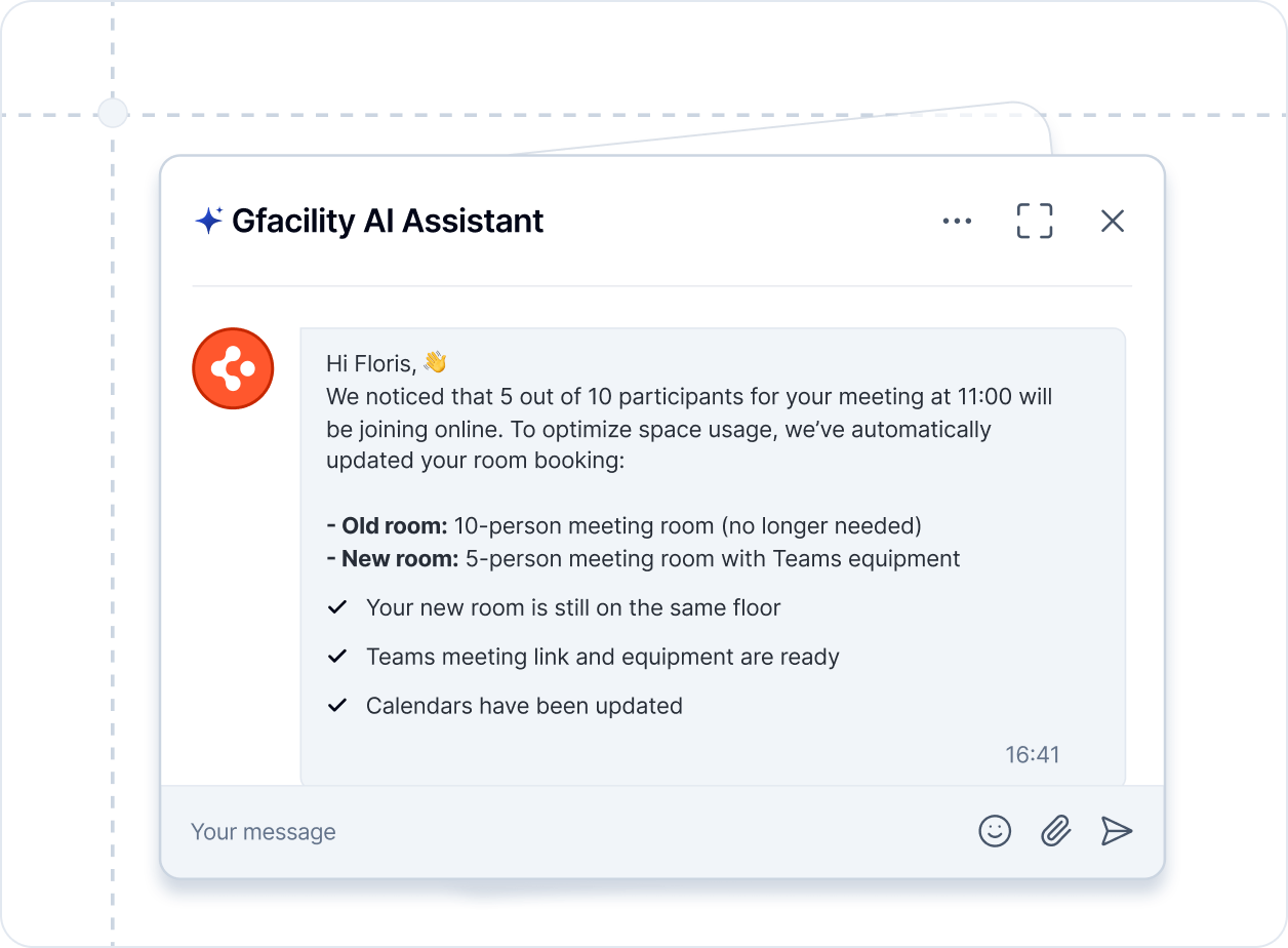 Employees plan meetings effortlessly in Microsoft Outlook or Google Calendar – booking rooms, catering, and visitors in one go. Communication with service teams happens naturally via Teams or Chat.