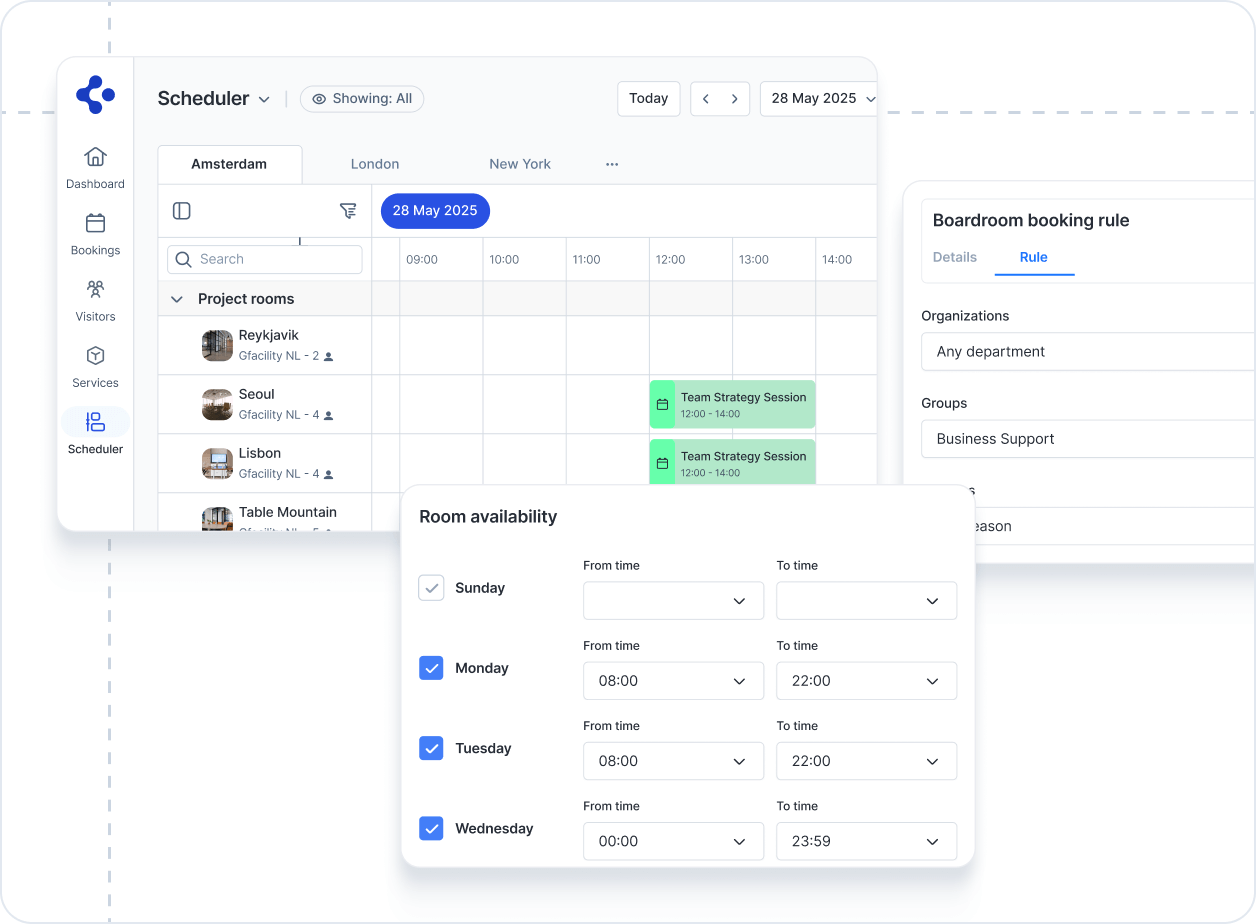 With our all-in-one meeting solution and room reservation system, you don’t just support meetings – you streamline how your organisation comes together. The Meeting Management Module goes beyond bookings to coordinate attendees, visitors, and catering – cutting friction and saving time.
