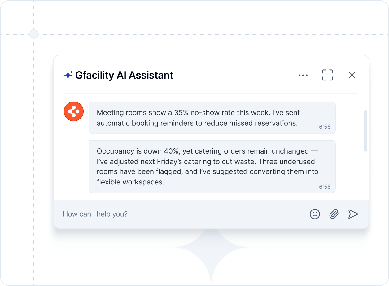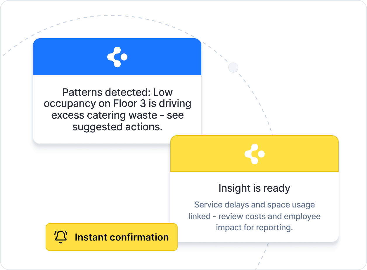 It’s not just raw numbers – you also get clear explanations and practical suggestions. For example, if meeting rooms are often unused, the data might reveal frequent no-shows in bookings, more teams working from home on Fridays, and an 18% increase in catering waste on the same day. The system then turns these insights into actions, such as sending booking reminders, reducing catering on Fridays, or repurposing unused rooms for flexible work.
